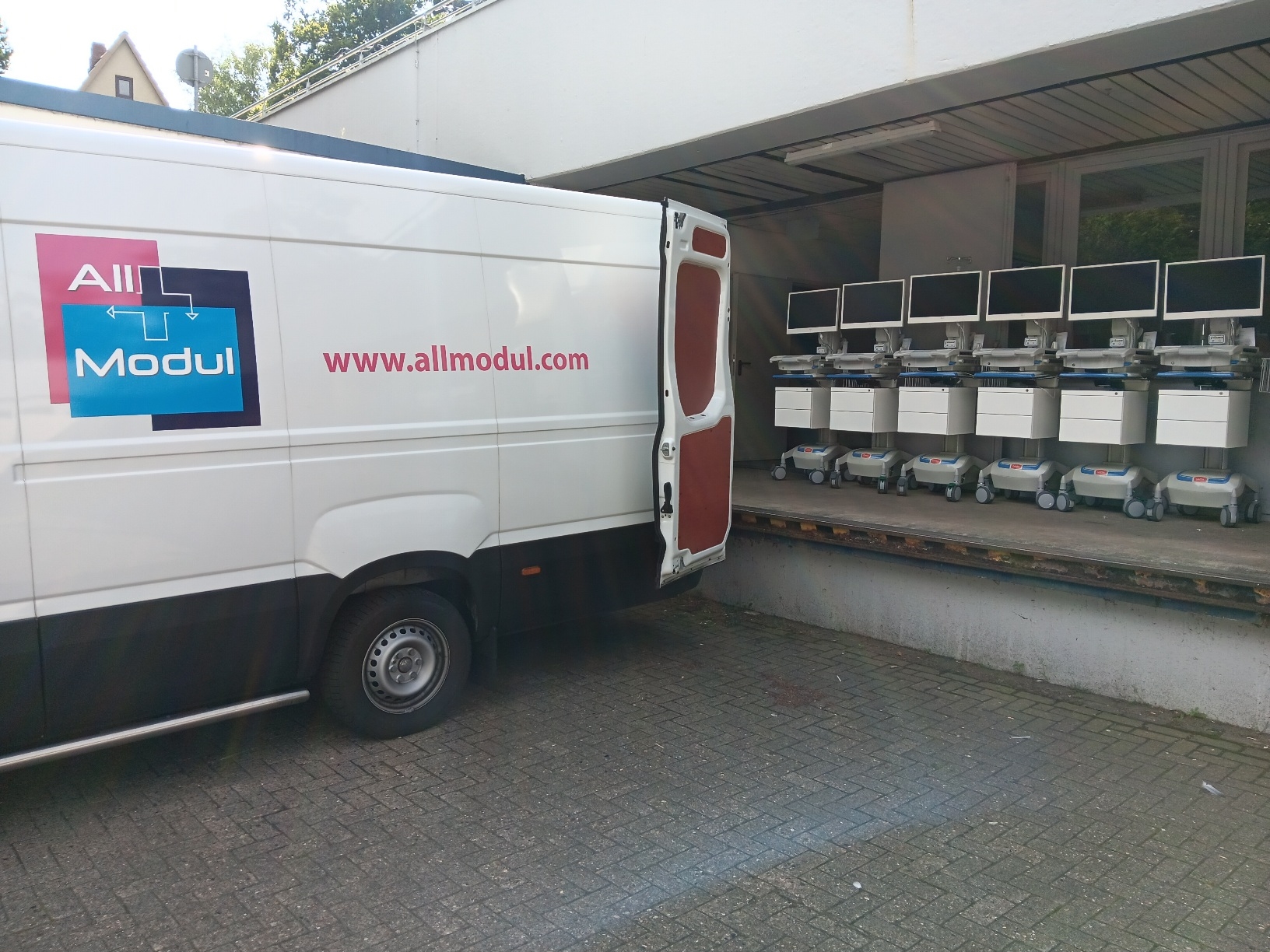 der Gesundheit Nord angeliefert. Die digitalen Pflegewagen mit Schubladen und diversen Zubehören sind mit einem LG AIO-PC mit IGEL OS ausgestattet und können über die Wagenbatterie für min. 12h mit Strom versorgt werden.