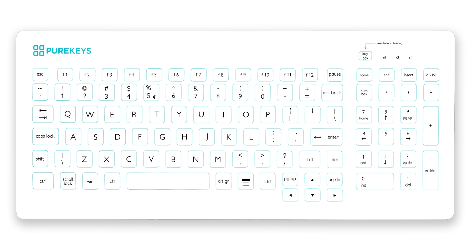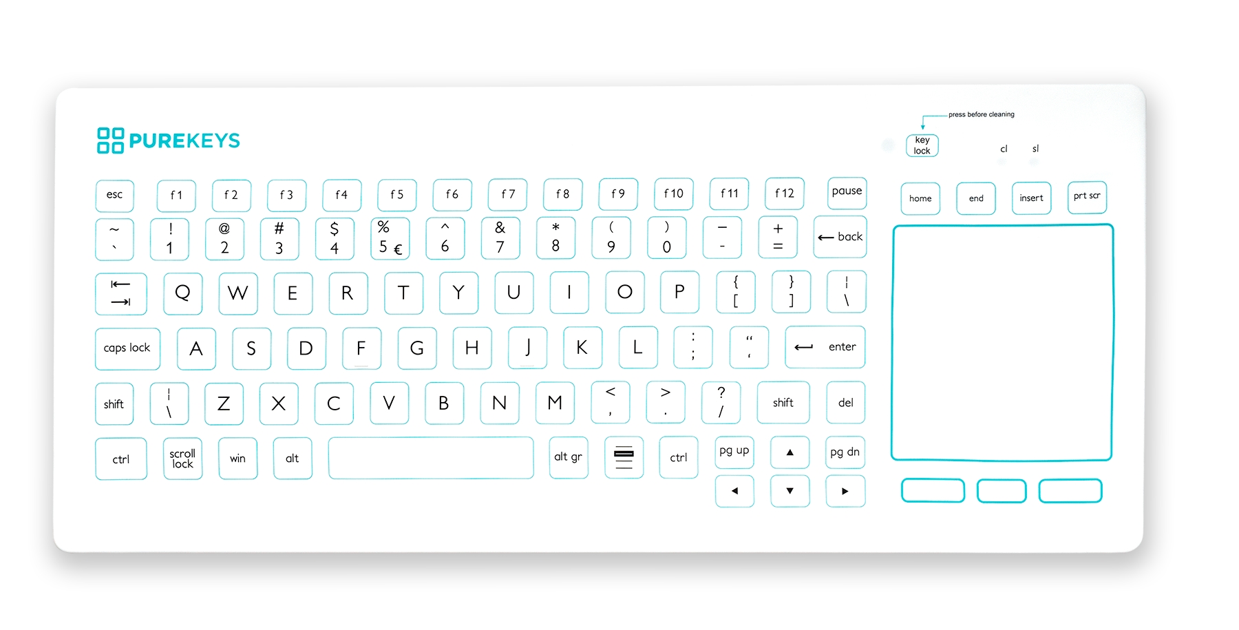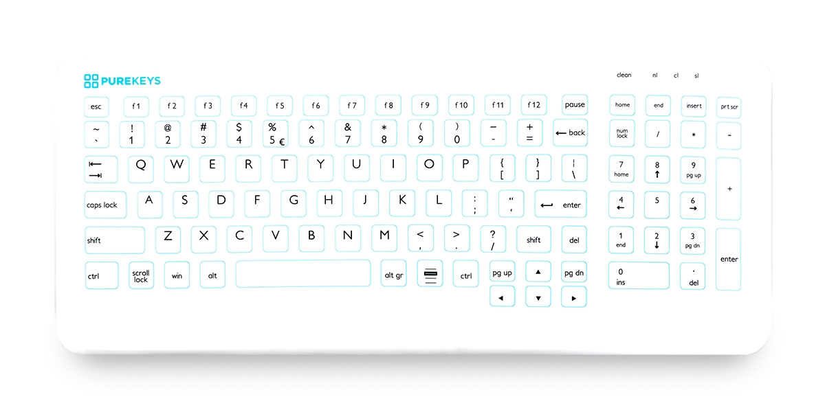Mit einem Druck auf die separate „Tastensperre“ (key lock) können die Tasten während der Reinigung und Desinfektion gesperrt werden. Die medizinischen Tastaturen von Purekeys sind resistent gegen alle bekannten Desinfektionsmittel wie Alkohol, Peroxide, Chlorlösungen usw. Das verwendete weiße Silikon ist von sehr hoher Qualität. Die