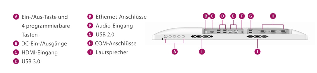 - 3 x COM-Port, 1 x Audio-Ausgang, 1 x HDMI-Ausgang, 1 x DC-in
