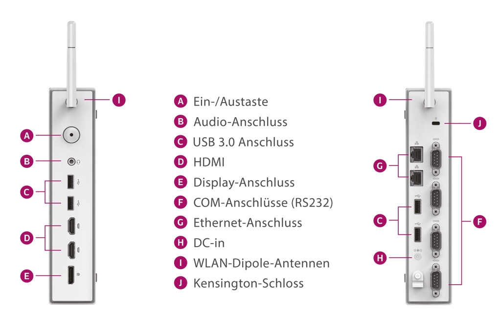 Der Mikro-PC lässt sich gut mit dem medizinischen Monitor DT 724 kombinieren. Der medizinische Monitor verfügt über einen einzigartigen Stromausgang, um z.B. Thin Clients mit Strom zu versorgen.